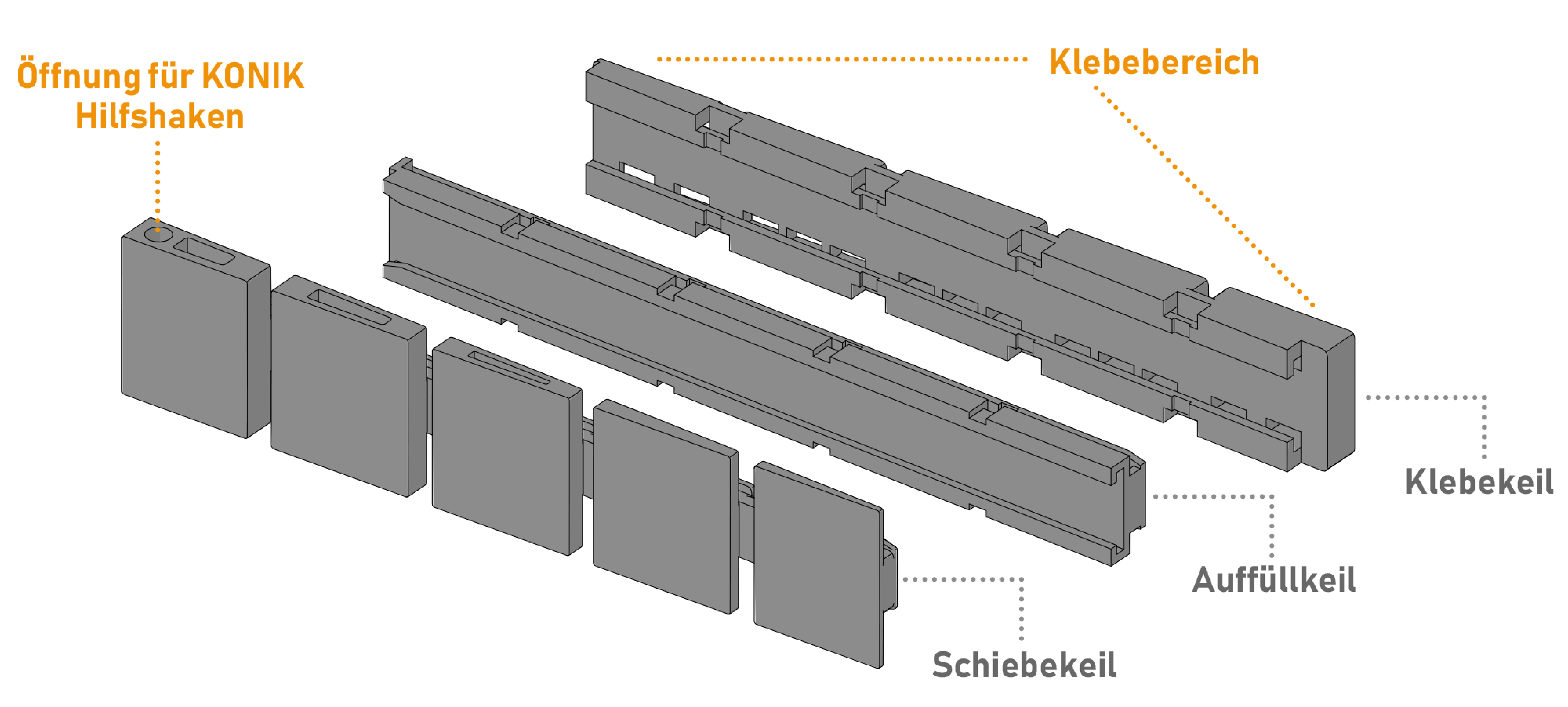 Unsere Montagesets bestehen aus jeweils einem Schiebekeil, einem Klebekeil und einem Auffüllkeil.