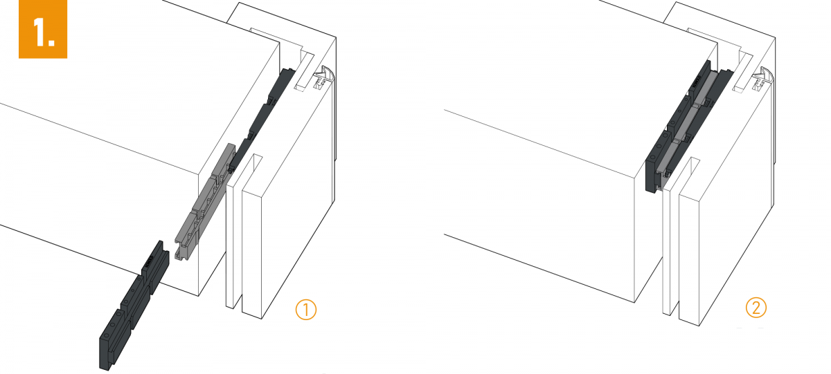 Platzieren Sie den KONIK Klebekeil auf dem Futterbrett. Nutzen Sie hierfür den Klebestreifen auf der Rückseite des Klebekeils. Der Abstand zu Wand kann mit KONIK Auffüllkeilen angepasst werden. Anschließend den KONIK Schiebekeil platzieren.